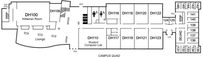 - Restrooms - Across from Student Computer Lab, room DH110. If entering from the quad, turn right down to the classroom hallway. The restrooms are on the immediate left.