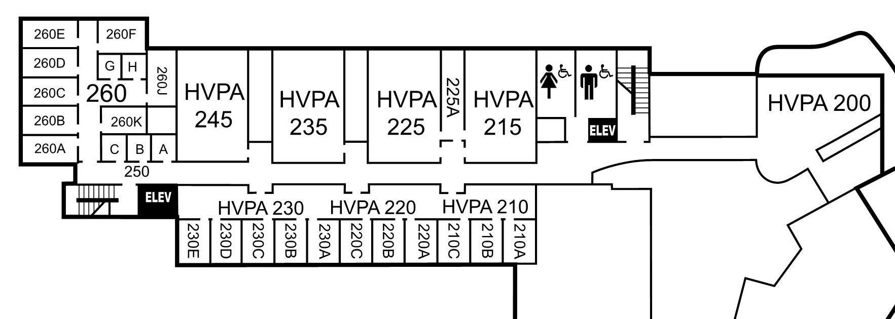 - Classrooms - HVPA 215 through HVPA 245 - to the right of the stairwell, on the right side of the hallway