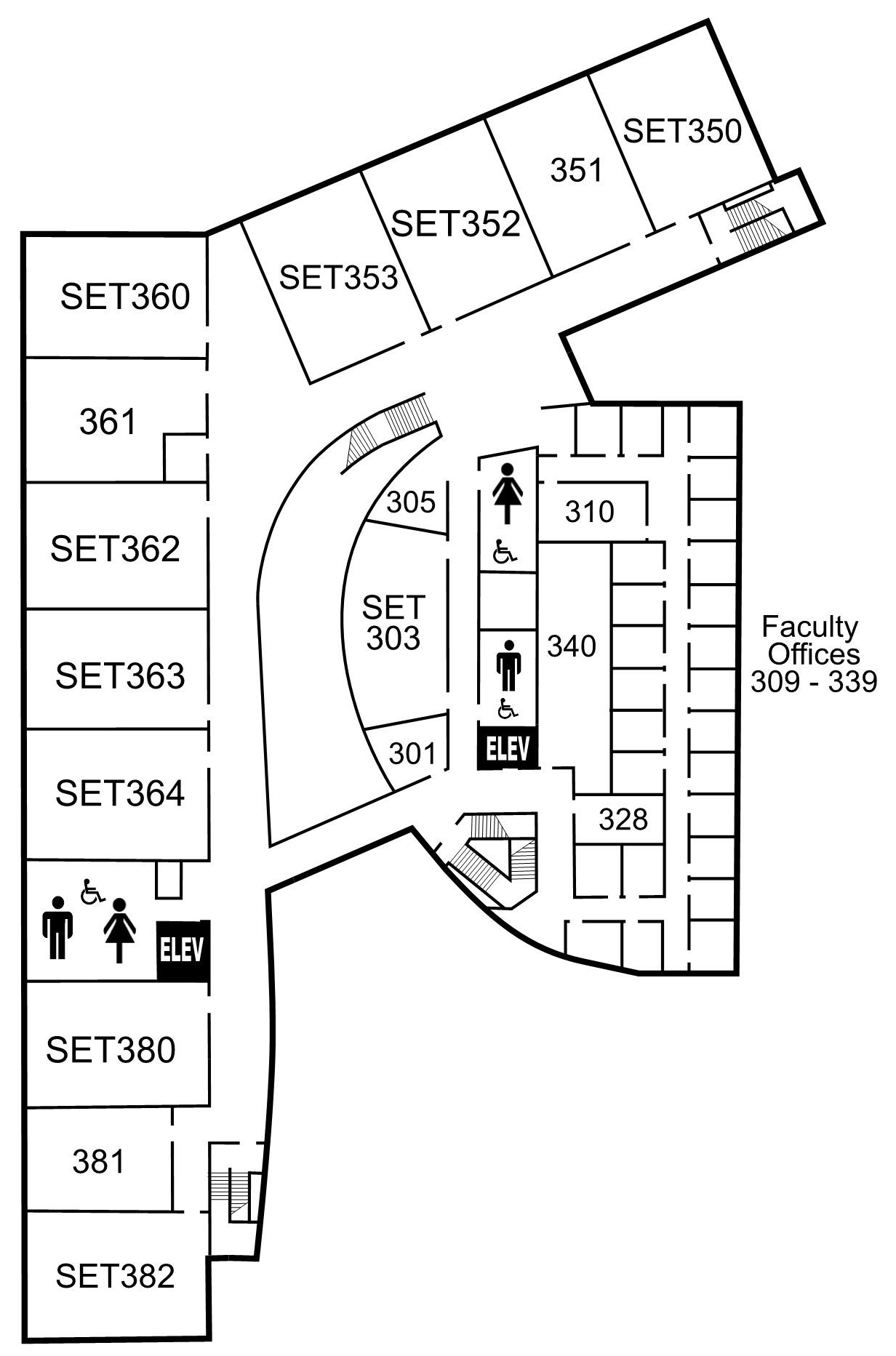 - SET301 - If entering from the elevator that was closest to the SET Community Room, turn right and room SET301 will be directly across from the inside stairwell.