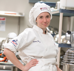 Sabrina, standing by an industrial mixer, in the culinary lab. I've enjoyed everything about this experience." Sabrina fell in love with baking at an early age. Now, she's ready to enter the industry.